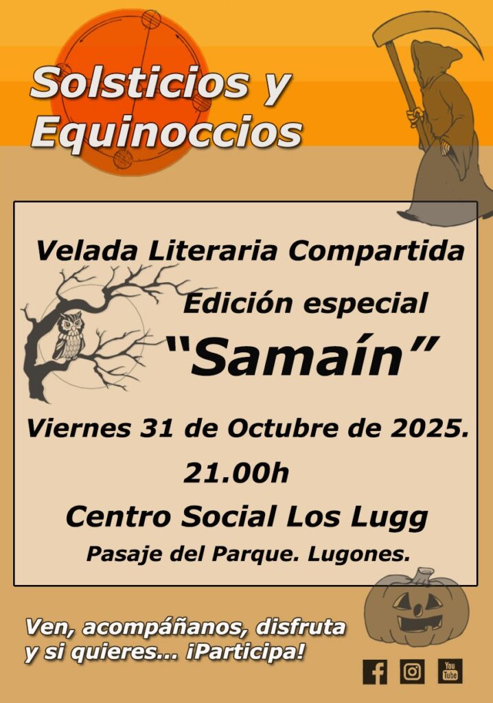 Así que nos animamos con esto. Hemos planificado esta Velada literaria compartida especial 🎉 para el día de Samaín. En esta ocasión, se celebrará en el Centro Social Los Lugg, en Lugones. Un sitio en el que se hacen cosas muy chulas e interesantes.