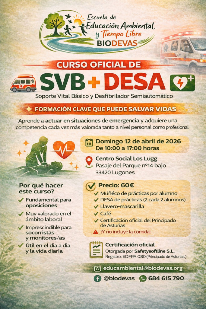 La Escuela de Educación Ambiental y Tiempo Libre Biodevas pone en marcha dos nuevas ediciones del Curso Oficial de SVB + DESA (Soporte Vital Básico y Desfibrilador Semiautomático) , una formación práctica y dinámica que te capacitará para actuar en situaciones de emergencia ⚡
