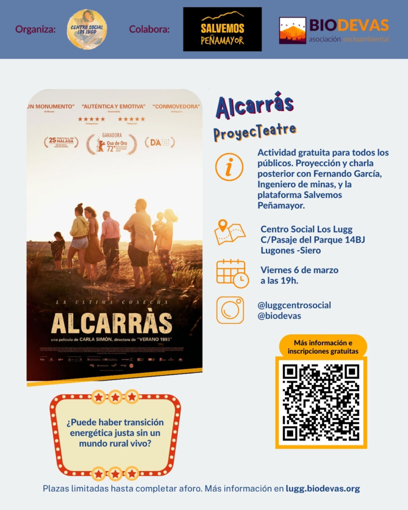 Tras la proyección abriremos un espacio de diálogo con las personas asistentes, con la participación del ingeniero de minas Fernando García Magdalena y la presencia de la plataforma Salvemos Peñamayor, para compartir miradas y experiencias sobre los cambios que viven los territorios rurales.