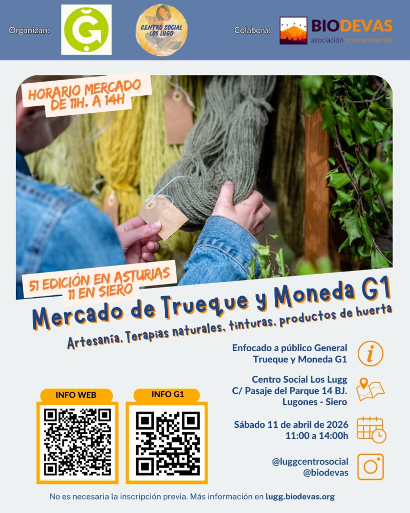🌱 Este sábado 11 de abril celebramos la 51º edición del Mercado de Trueque y Moneda Libre G1 en Los Lugg Centro Social 🤝 Habrá puestos de artesanía, productos de huerta, terapias naturales y servicios, además de punto de información sobre la moneda libre G1, apertura de monederos y materiales para iniciarte.